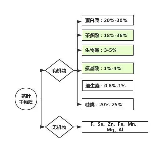 茶多酚也叫茶单宁,是一类存在于茶树种的多酚类物质总和。咖啡碱虽然叫做咖啡碱,但是茶中的咖啡碱比咖啡中多。茶氨酸是一种茶叶特有的氨基酸,在其他植物中极为罕见。